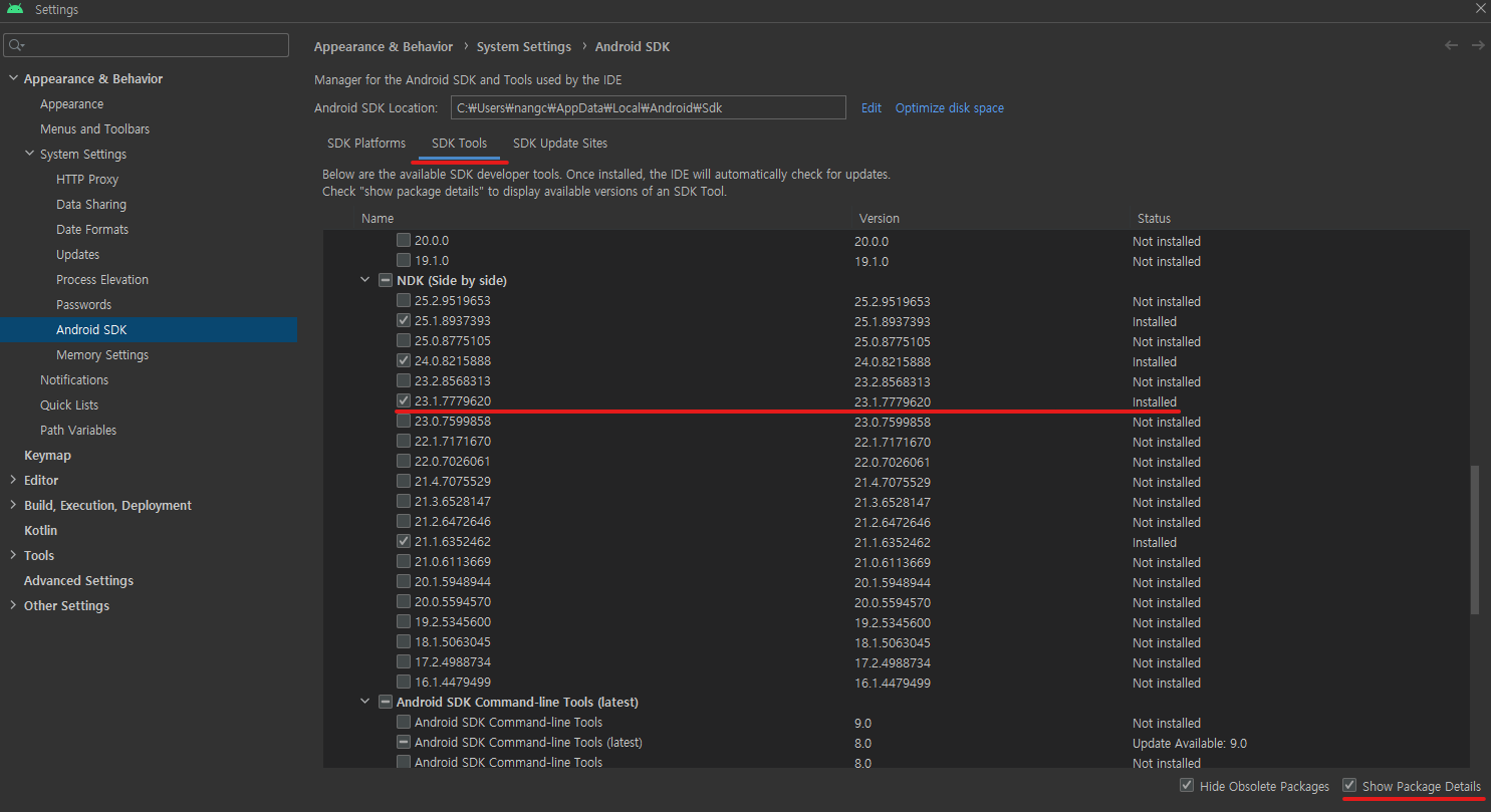 설치되는 위치는 일반적으로 C:/Users/[계정ID]/AppData/Local/Android/Sdk/ndk 이다.