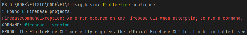 Firebase crashytics 를 사용하려면 Firebase cli를 먼저 설치한뒤 configure 해야 하는데, configure 가 되지 않고 아래의 오류 메시지만 뜬다.