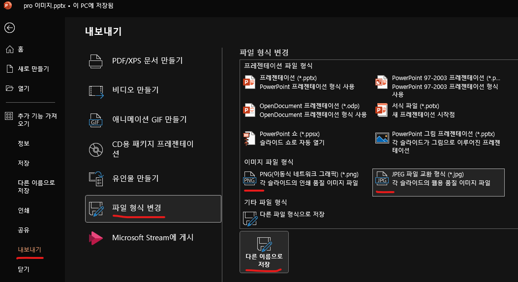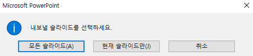 [파일 형식 변경], [PNG] 또는 [JPEG] 를 선택한 뒤 오른쪽 아래에 있는 [다른이름으로 저장] 버튼을 눌러준다. 그리고 저장할 폴더를 선택하고 확인을 누른다. 팝업창에서 [모든 슬라이드]를 누르면 끝.