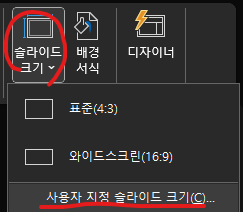 3. 아래 메뉴에서 [슬라이드 크기]를 선택한뒤 [사용자 지정 슬라이드 크기]를 선택 한다.