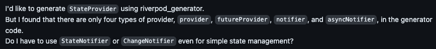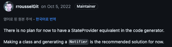 기존에 작성한 코드에서 Riverpod 의 StateProvider 를 이용한 것이 있는데, 이 코드를 Riverpod Generator 를 활용하는 코드로 migration 하려고 보았더니 Generator 에서는 State Provider는 지원하지 않는다.