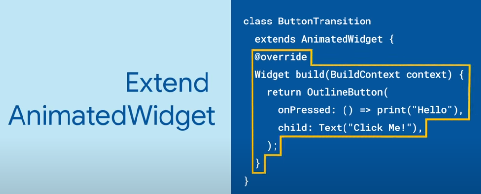 AnimatedWidget은 추상 클래스로 그자체로는 위젯은 아니다. 원하는 애니메이션을 만드는데 유용한 도구이다. 이미 제공되고 있는 AnimatedWidget으로는 DecoratedBoxTransition, SlideTransition, RotationTransition, FooTransition 위젯 등이 있다.