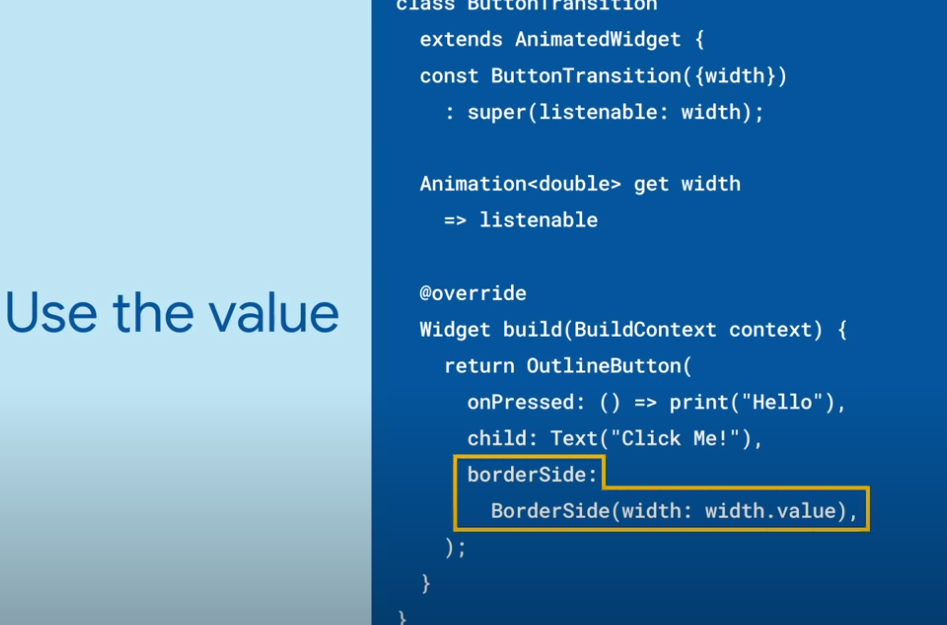 두번째는 업데이트된 값이 있을 경우 당신의 위젯에 알리는 것이다. 그리고 그 값을 AnimatedWidget의 superclass에도 listenable argument로 전달해야 한다.