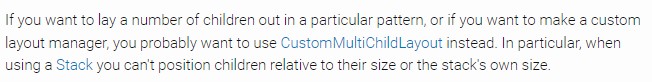 그럼 Stack안에서 LayoutBuilder를 이용해서 contraint로 size를 받아서 그 값을 기반으로 relative positiond을 계산한뒤 children을 배치하는 class를 만들어야 하거나, 위의 api doc에서 말한거처럼 CumstomMultiChildLayout을 사용해야 할 것같다.