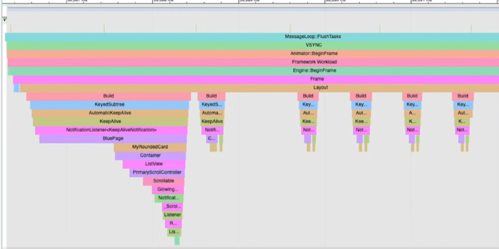 Flame chart는 위와 같은 모양이며 widget이 필드되면서 얼마만큼의 시간을 잡아먹는지 그리고 그 빌드 안에서 세부 항목들이 얼마나 시간을 잡아먹는지를 bar 그래프로 확인할 수 있다. 아래는 실제 앱의 flame chart 예이다. (flame chart라고 부르는게 아래서 위로 보며 flame같아보여서라고한다...농담인가 진담인가....??)
