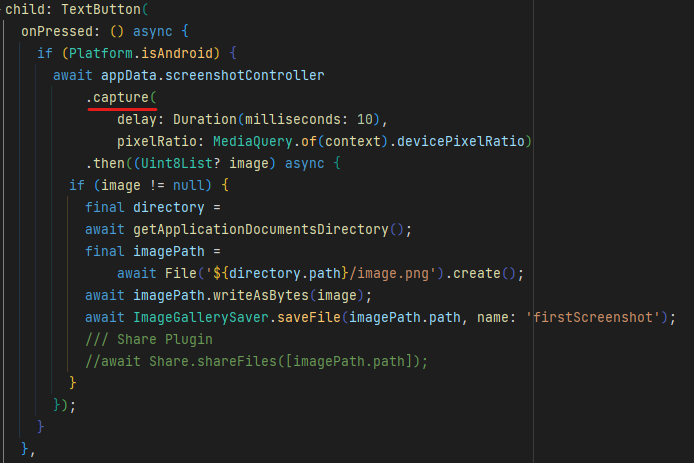 나의 경우, 버튼을 만들어서 onPressed 프로퍼티에 캡쳐 실행 코드를 입력
