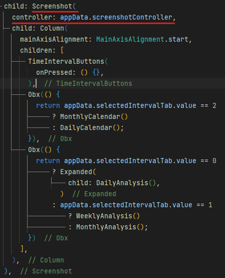 캡쳐를 원하는 위젯을 Screenshot 위젯으로 감싸고, controller 프로퍼티에 앞에서 생성한 screenshotController를 넣어준다.(아래 참고)
