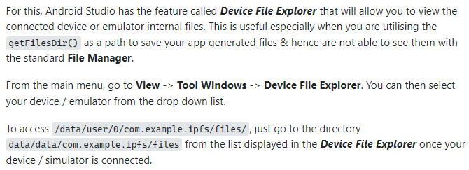 Android Studio에 있는 device file explorer를 이용해서 해당 폴더 보려고 하나면, getApplicationDocumentDirectory( ) 에서 받아온 디렉토리 path를 그대로 따라가면 안된다. 아래 와 같이 /data/user/0/ 까지의 부분을 /data/data/ 로 치환하여 그 경로로 찾아가면 확인 가능하다. (아래 캡쳐의 원문 링크)